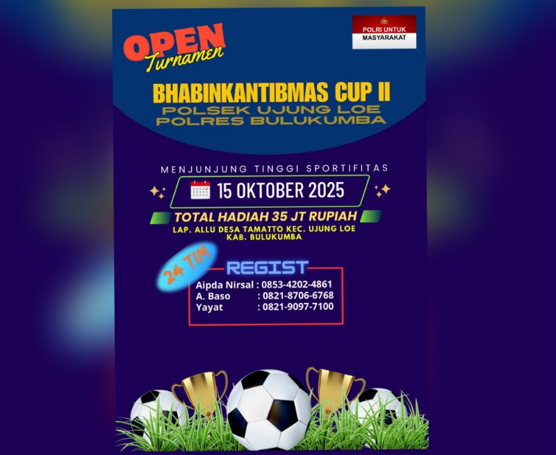 Ketfo : Turnamen Sepak Bola Bhabinkamtibmas II Kecamatan Ujung Loe digelar Oktober 2025 RUBRIK.co.id,BULUKUMBA- Turnamen sepak bola Bhabinkantibmas Cup II Polsek Ujung Loe Polres , kabupatenBulukumba kembali akan di gelar pada bulan Oktober 2025 mendatang.